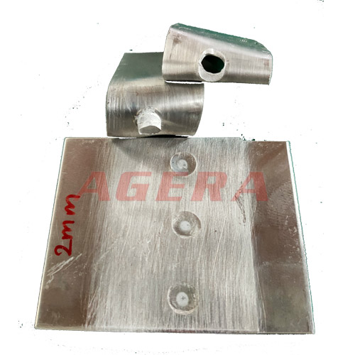 此焊接产品为2+2mm铝板点焊焊接产品,采用安嘉自动化中频直流逆变点焊机,安嘉焊接工艺工程师调整好合适的焊接工艺参数,上下电极夹紧焊接而成,焊接成型后,熔合好,破坏试验可以拉穿母材。